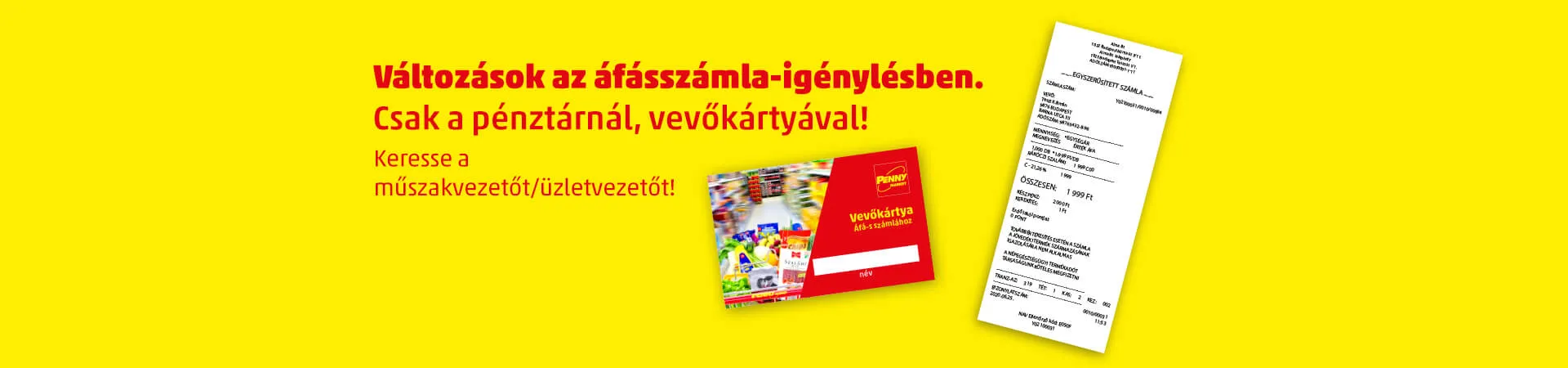 Felhívjuk figyelmüket, hogy jogszabályi változás következtében 2020. július 1-jétől a kibocsátott számlán fel kell tüntetni a terméket beszerző vevő áfaalany adószámának első 8 számjegyét, vagyis a vevői adószámot. Amennyiben Ön, mint áfaalany jár el, kérjük, hogy ellenőrizze a számla adattartalmát és amennyiben az adatok hiányosak, úgy azt jelezze a Pénztáros felé. A pénztártól való távozás után a számla adattartamára vonatkozóan reklamációt nem fogadunk el!