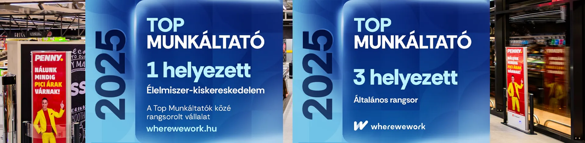 A PENNY 2025-ben harmadszor szerezte meg az első helyet az élelmiszer-kiskereskedelmi kategóriában a WhereWeWork nemzetközi karrierplatform TOP Munkáltatók rangsorában, amely jelenlegi és korábbi munkavállalók értékeléseire épül. A vállalat emellett másodszor került a teljes, 50 céget felvonultató lista legjobb három helyezettje közé.