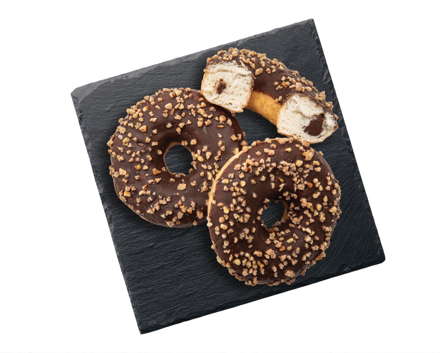 Készre sütött, gyorsfagyasztott majd kiengedett gyűrűs fánk mogyorós töltelékkel, mogyorós szórással