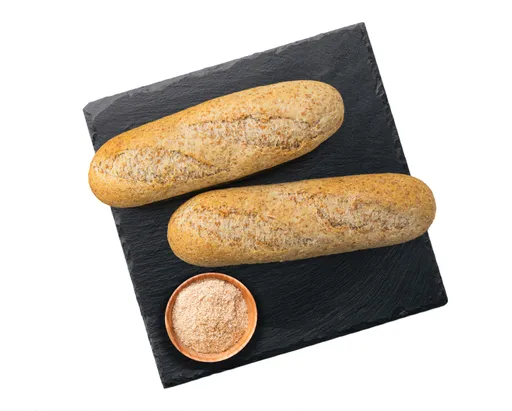 Elősütött, gyorsfagyasztott, készre sütött mini korpás bagett.