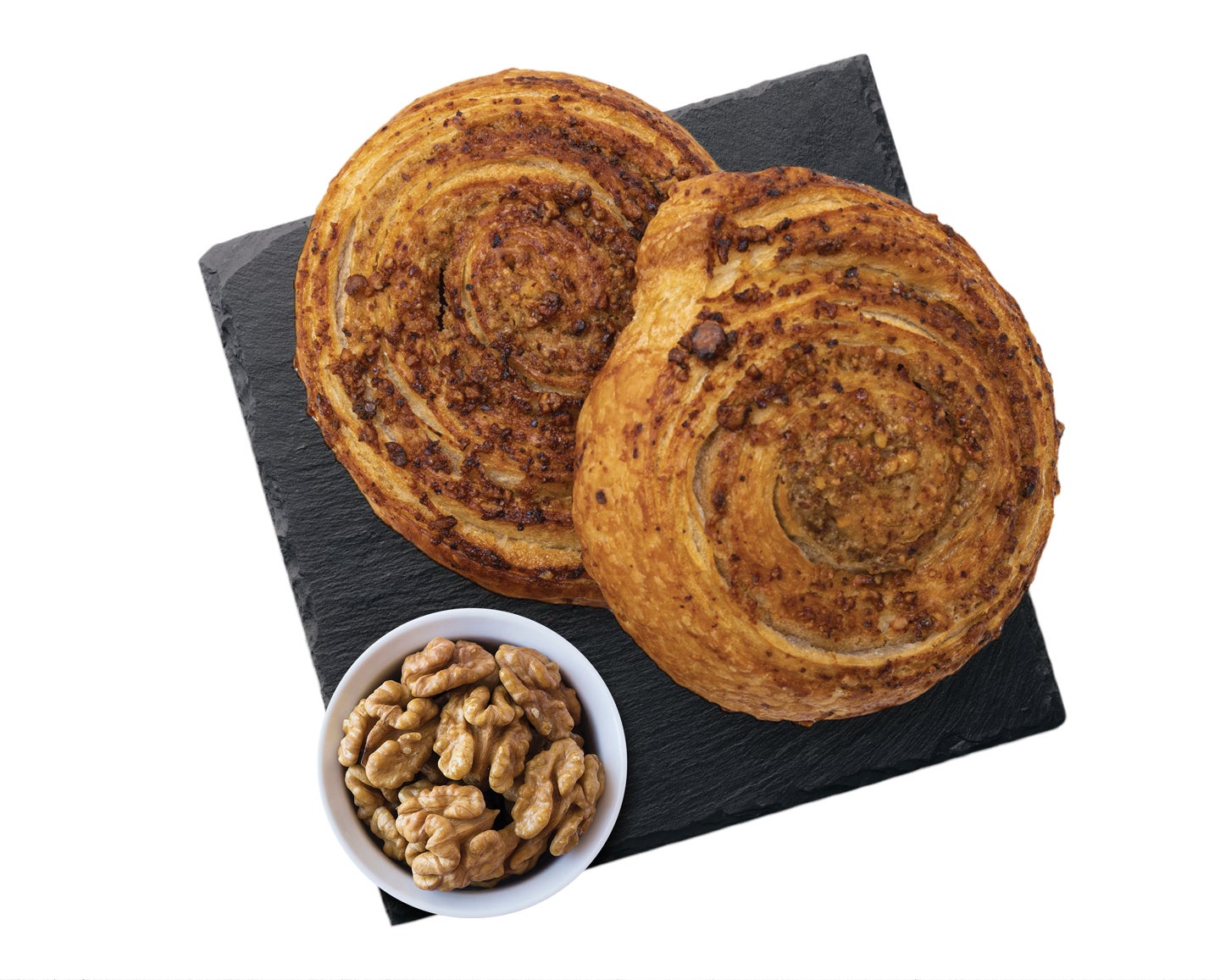 Előkelesztett, gyorsfagyasztott leveles tészta diós-dejós töltelékkel.