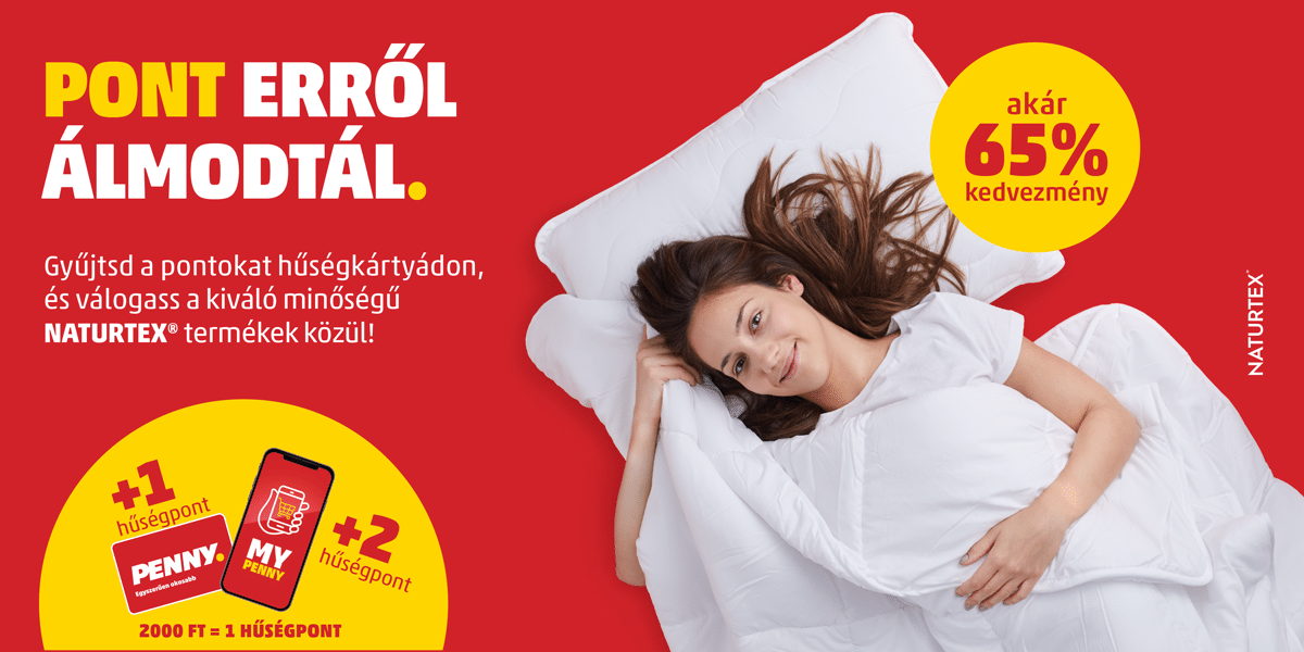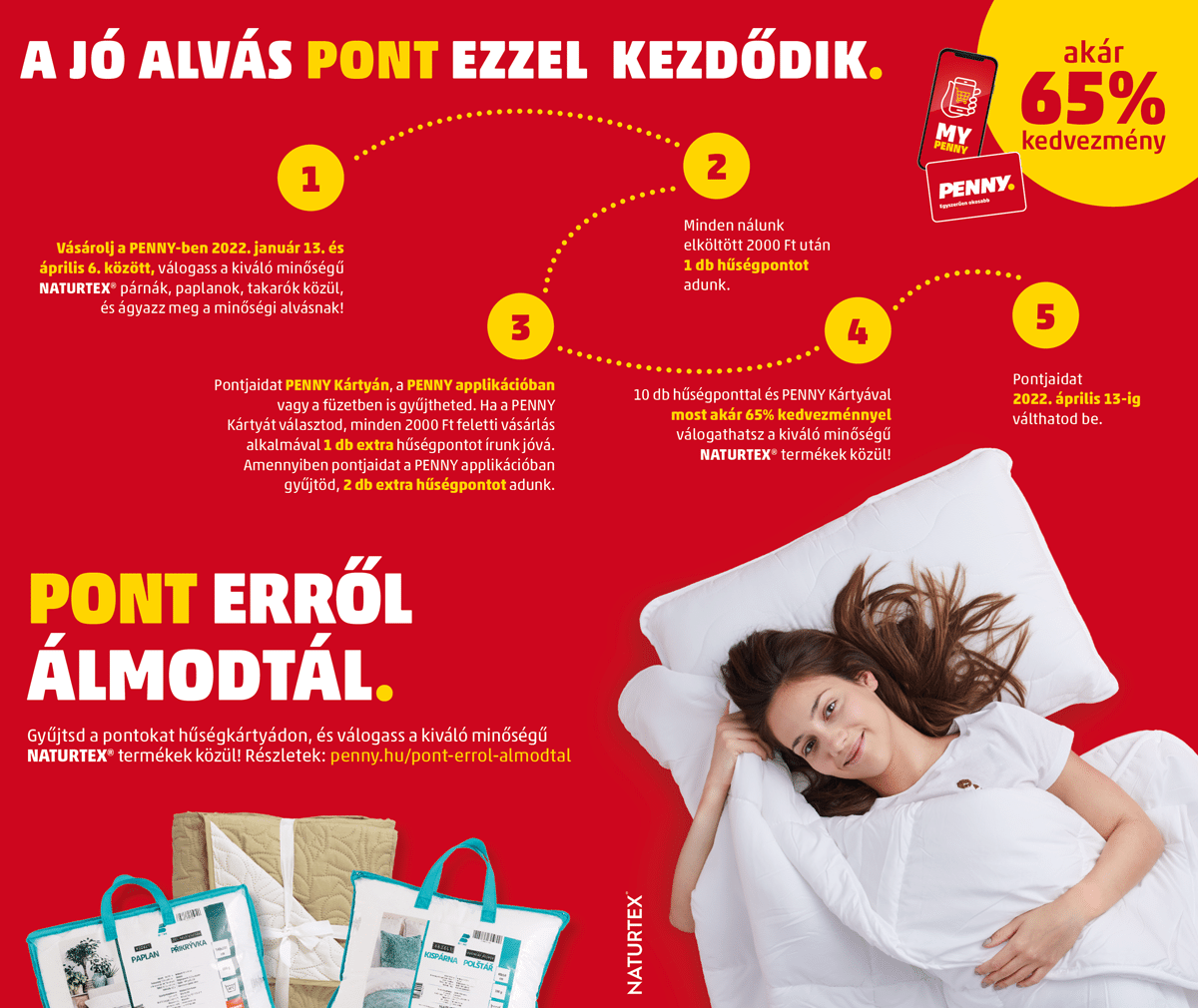 Vásárolj a PENNY-ben 2022. január 13. és április 6. között, válogass a kiváló minőségű Naturtex® párnák, paplanok, takarók közül, és ágyazz meg a minőségi alvásnak!