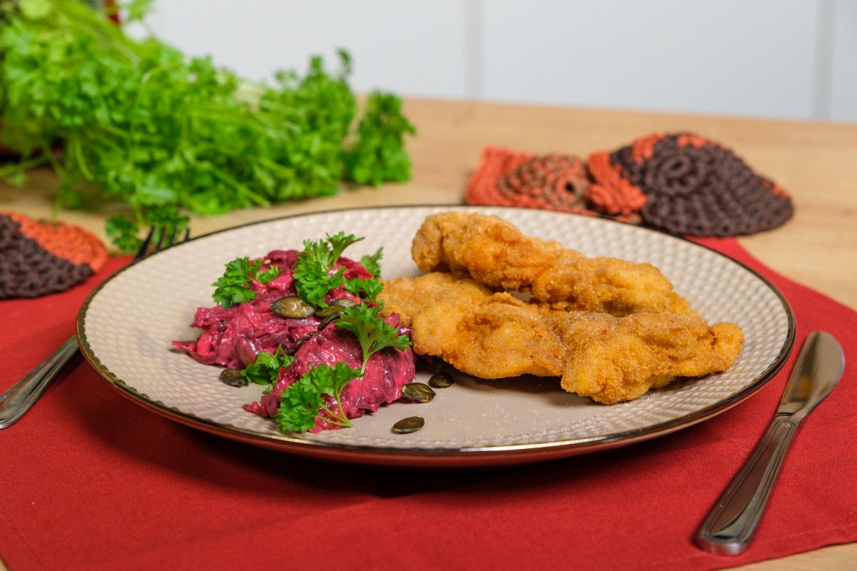 Rántott csirkecomb céklás-almás-tökmagos salátával