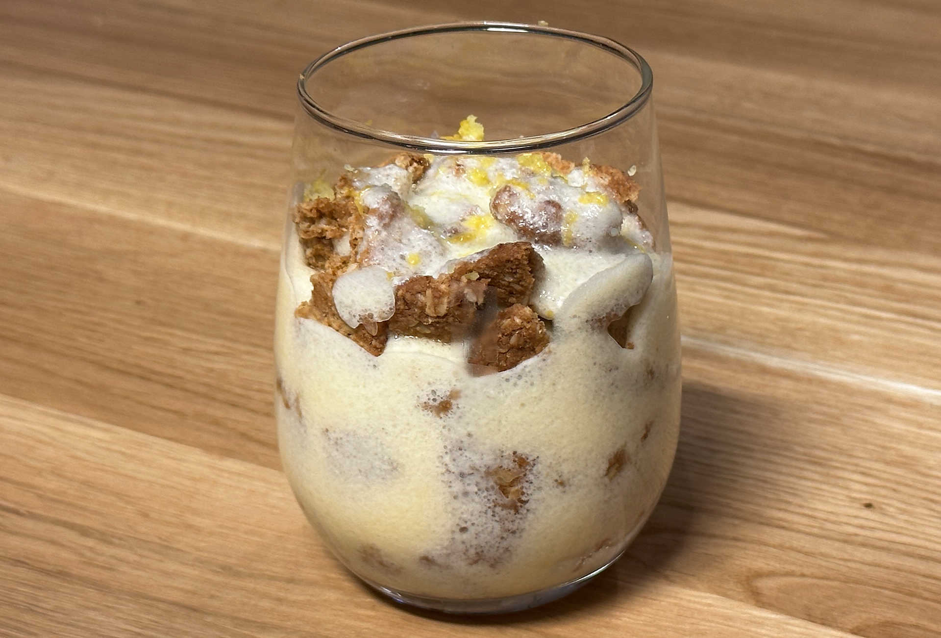 Kínálópoharak aljára teszünk egy vékony réteg összezúzott zabkekszet, erre kanalazzuk a citromhabot és néhány órára hűtőbe tesszük. Díszíthetjük reszelt citromhéjjal, citromszeletekkel.