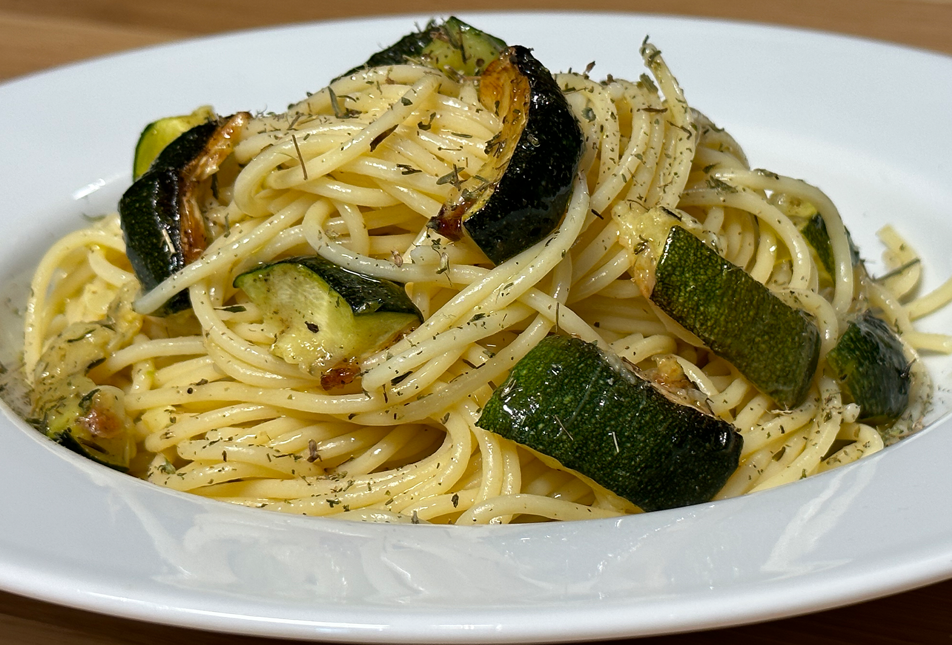 Egy nagy tálban összeforgatjuk a tésztát a fokhagymás-kakukkfüves cukkinivel és a sütéshez használt olajjal, valamint a félretett főző lével. Azonnal tálaljuk.