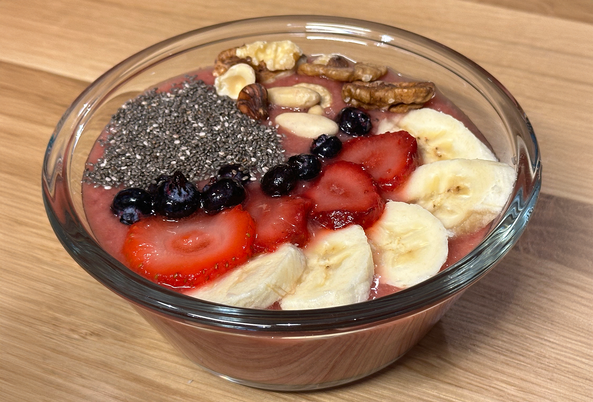 Ezután a friss gyümölcsöket, az aprított magvakat és a chia magot esztétikusan elhelyezzük a smoothie bowl tetején. Az így kapott étel annyira színes és tápanyagdús, hogy meg fogja adni a kellő löketet egy nehezebb naphoz is.