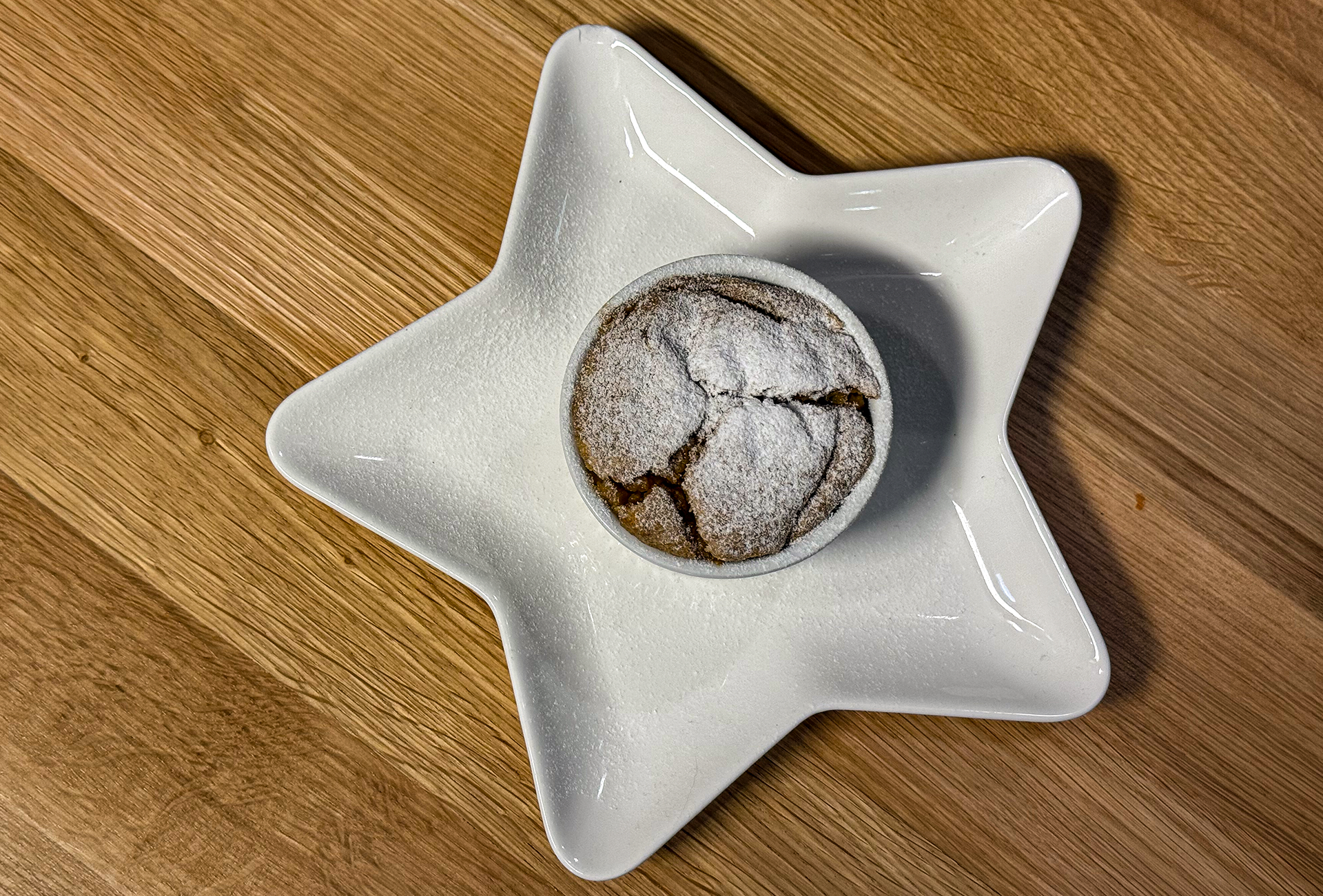 Kivajazunk 4 db tűzálló formát, majd meghintjük a porcukorral. Beletöltjük a kiflis keveréket, és vízzel töltött tepsibe állítjuk a formákat. 180 fokos sütőben kb. 45 percig gőzöljük. Díszíthetjük vaníliás porcukorral és egész kávészemekkel. Vaníliakrémmel vagy tejszínhabbal tálaljuk.