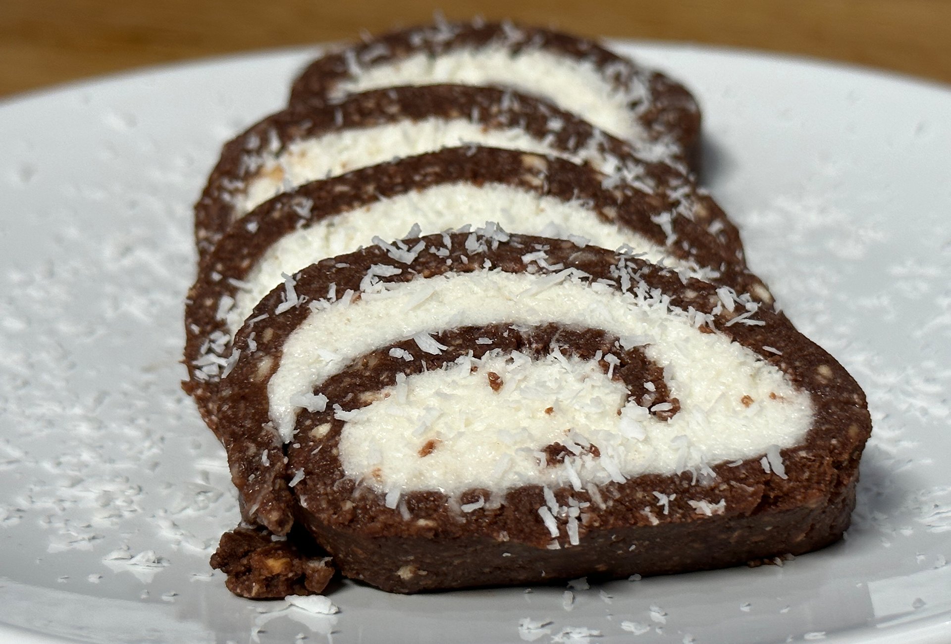 A tekercseket meghempergetjük a kókuszreszelékben, majd néhány órára a hűtőszekrénybe tesszük.
