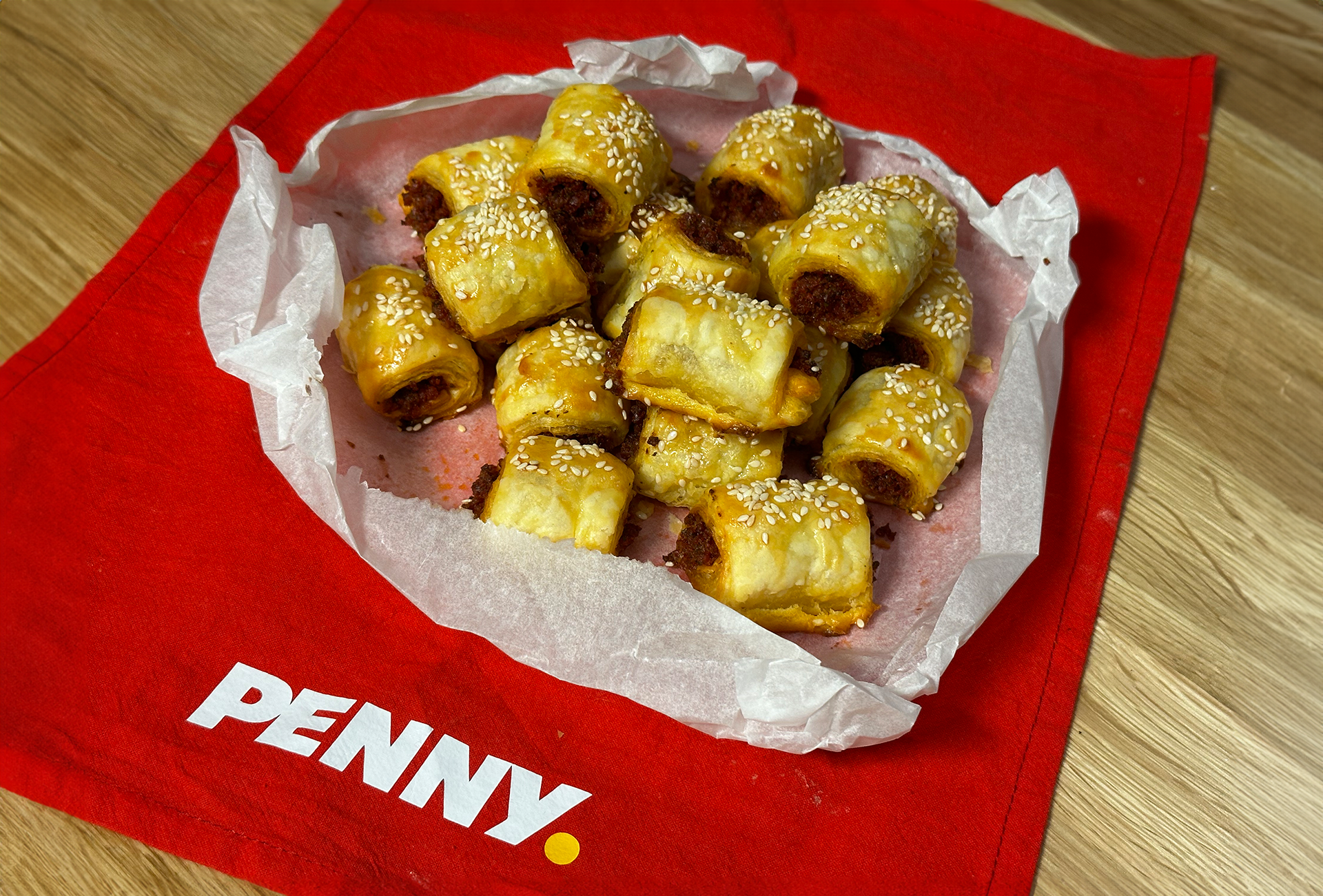 A kolbászkrémet 3 részre osztjuk, és hosszában a három tésztasáv alsó felére kanalazzuk. Feltekerjük mindhárom tésztadarabot, majd mindegyiket 8 részre vágjuk, így megkapjuk a kis kolbásztekercseket.