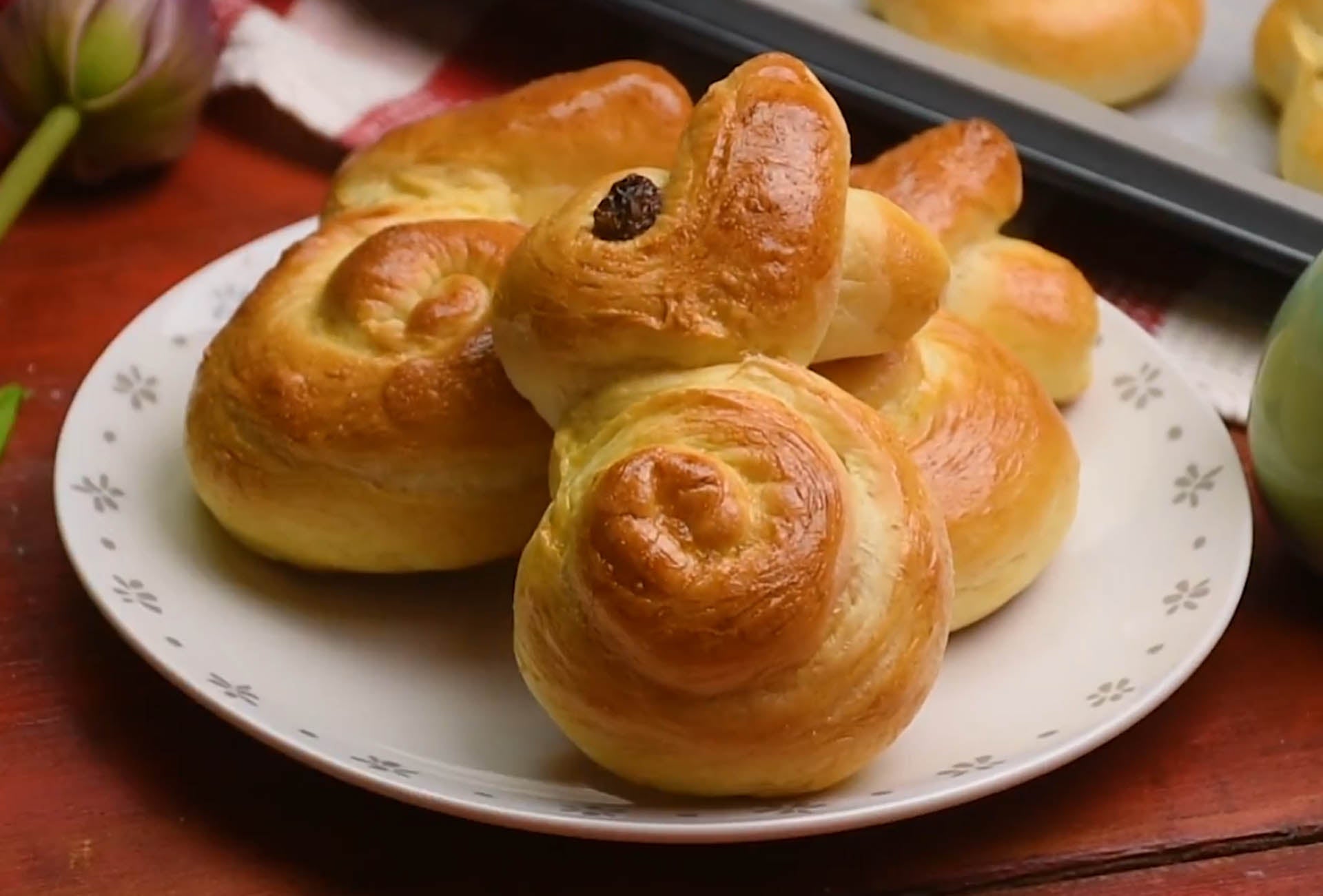 Az egyik rudat felcsavarjuk, a másikból pedig meghajtjuk a füleket. Megformázzuk a nyuszikat és alul a nyakuknál összecsippentjük a két részt, hogy ne nyíljanak szét a sütés közben. A szemek helyére mazsolát teszünk. A kész nyuszikat konyharuhával letakarjuk és egy 1/2 órát kelesztjük őket.