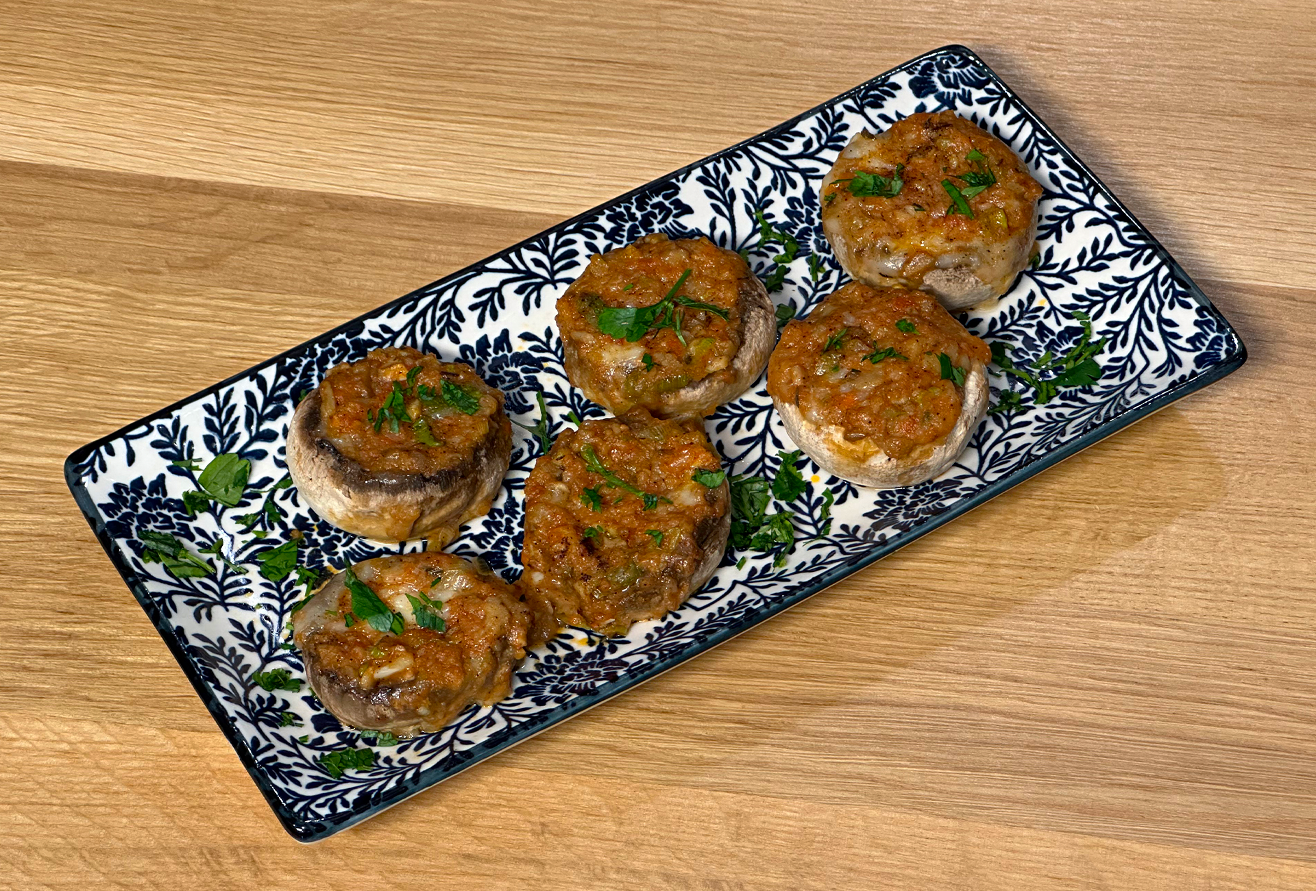 A keveréket a gombafejekre kanalazzuk, még ha nem is tölthető típusú gombákkal dolgozunk – ezek is ízletes falatkák lesznek. A megtöltött gombákra kevés borsot őrlünk, megszórjuk pici sóval, és bőségesen meglocsoljuk olívaolajjal, ügyelve, hogy mindegyik fejre jusson.