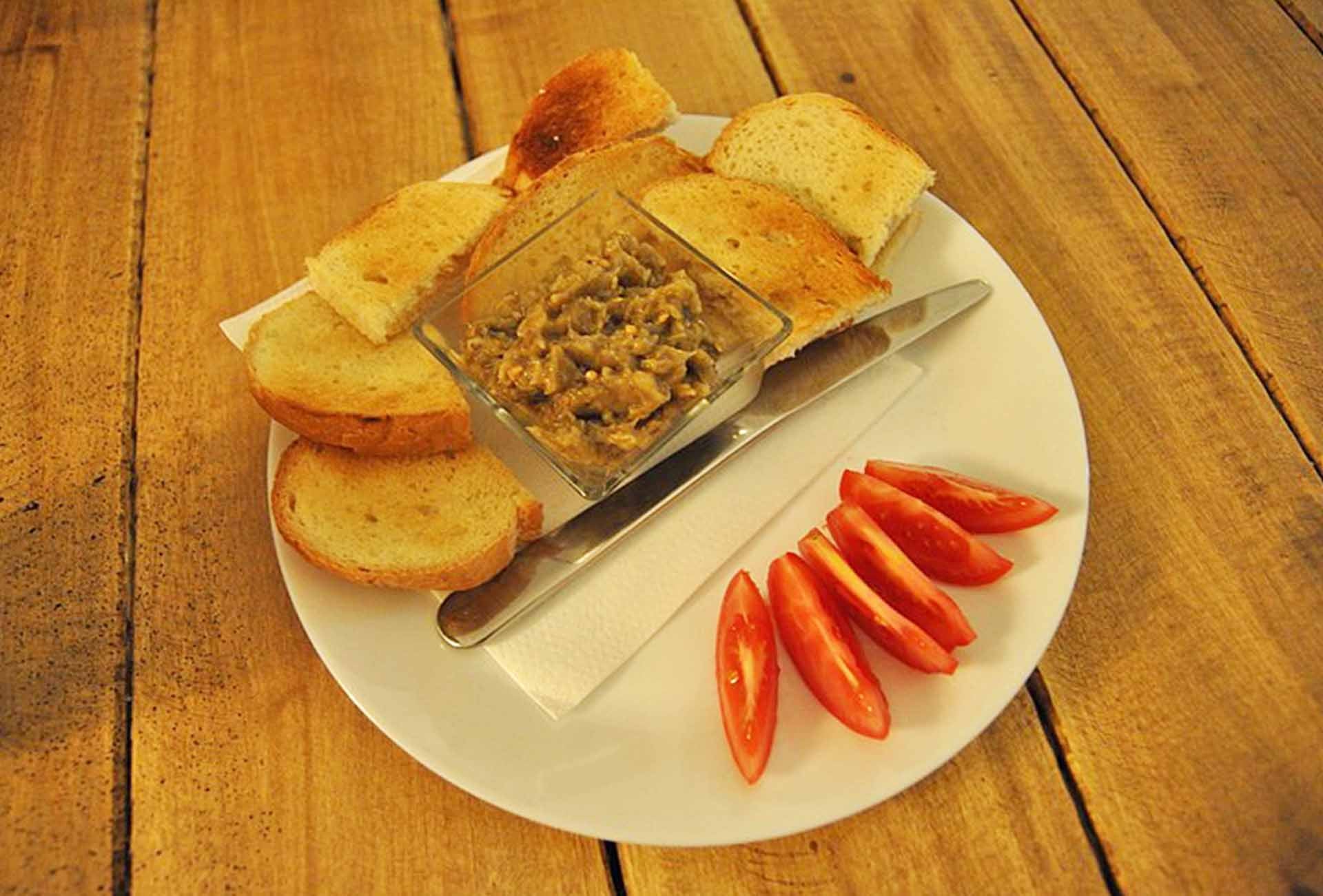 11 lépésA padlizsánt villával megböködjük, majd sütőben addig sütjük, míg megpuhul.22 lépésA héját meghámozzuk, majd összekeverjük a majonézzel, az apróra vágott lilahagymával, a sóval és a borssal.
