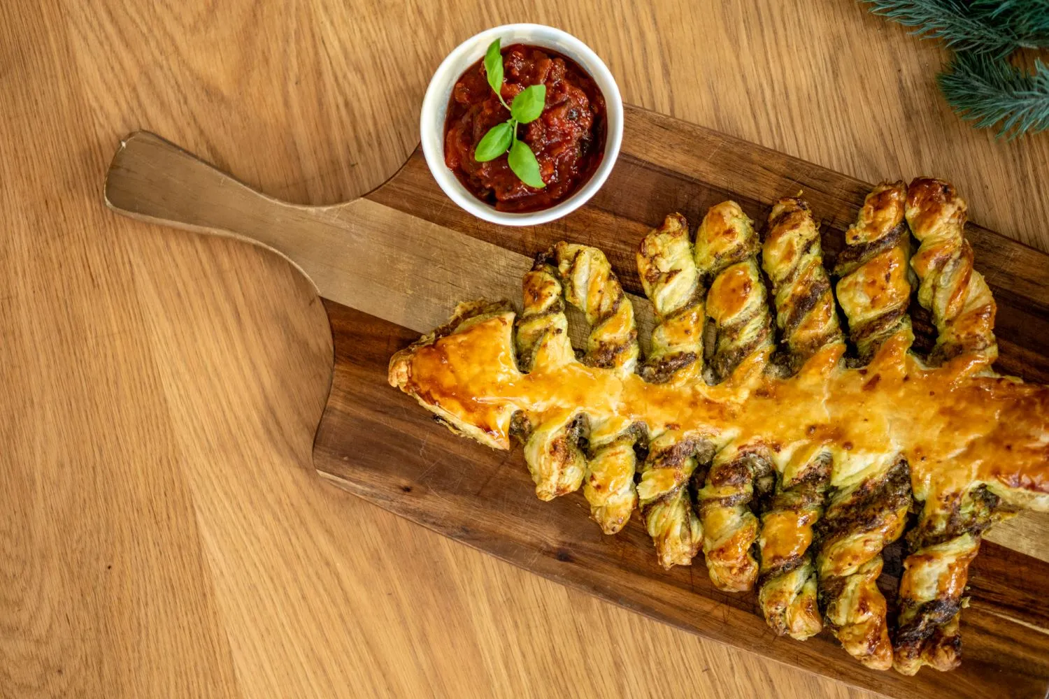Pesztós karácsonyfa paradicsomos mártogatóssal