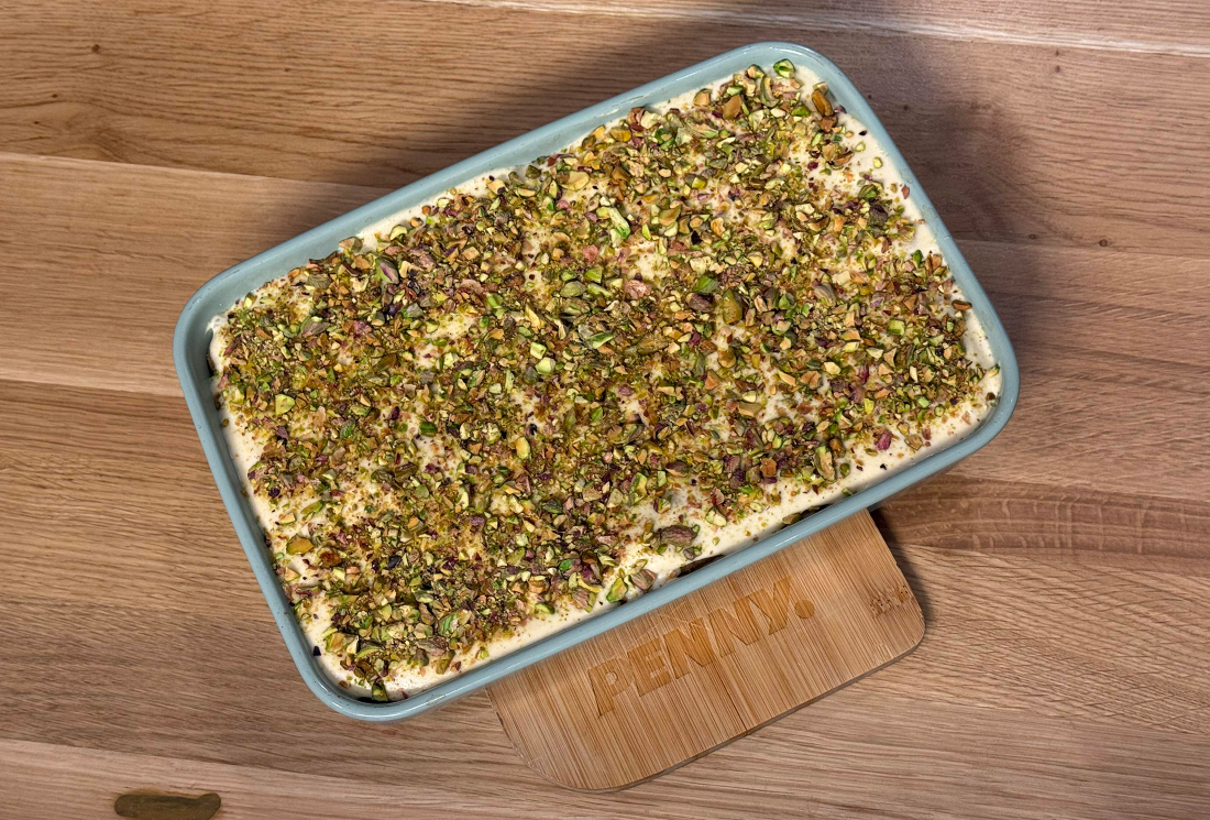Előveszünk egy 20 × 30-as kerámia sütőedényt, és ebbe rétegezzük a pisztáciás tiramisut.