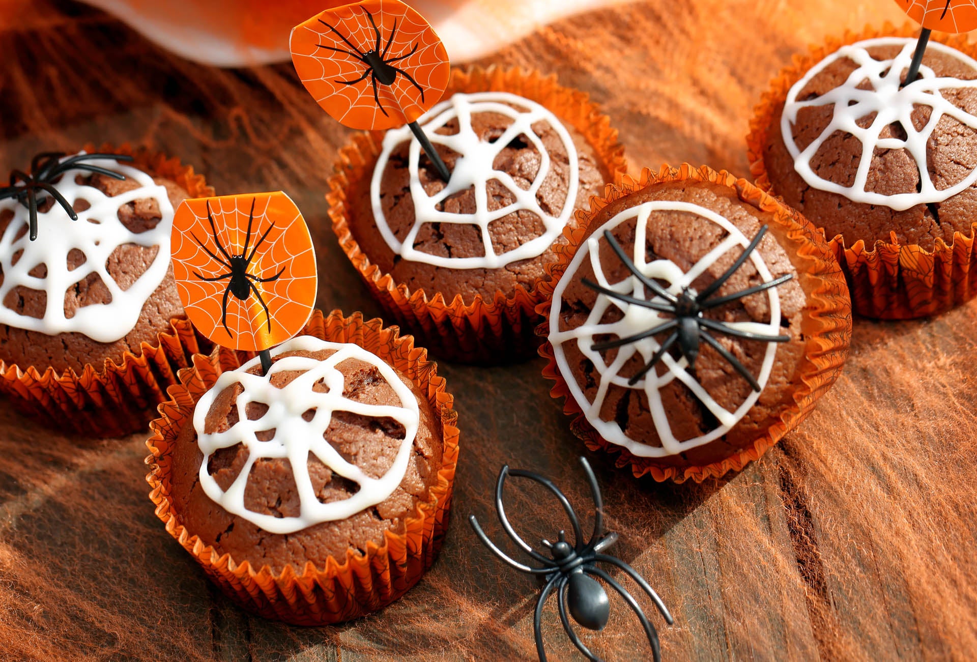 11 lépésAz étcsokoládét és a margarint gőz felett megolvasztjuk.22 lépésA tojásokat a cukorral kikeverjük, hozzáadjuk a csokit és a margarint, összekeverjük, végül a sütőporos lisztet is beleforgatjuk.33 lépésMuffin sütőbe adagolva előmelegített sütőben megsütjük.44 lépésA fehércsokit gőz felett megolvasztjuk és pálcikával pókhálót rajzolunk a muffinok tetejére.