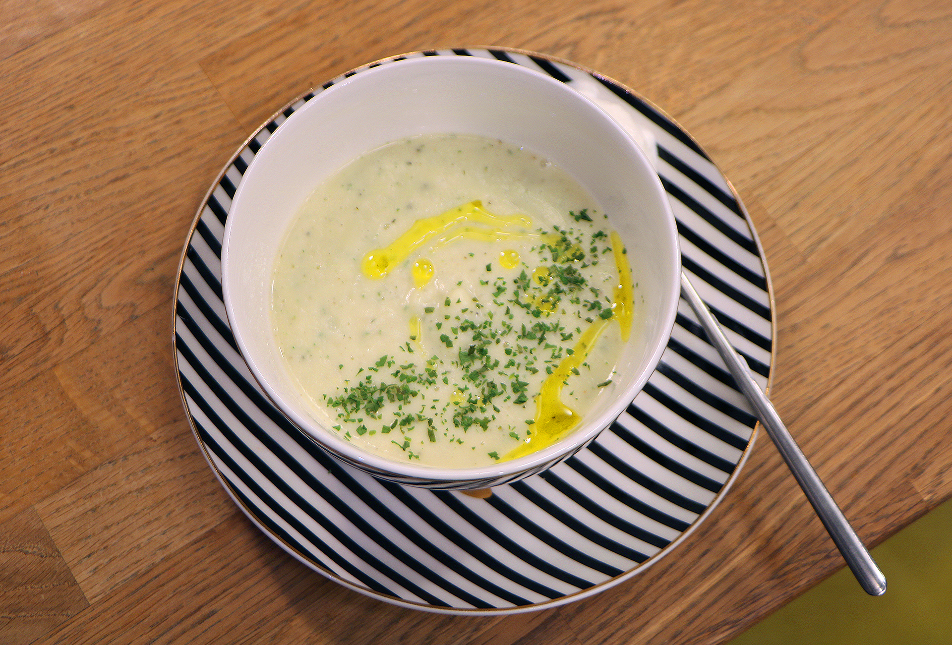 A felezett és nagyobb darabokba vágott póréhagymát olívaolajon megfuttatjuk, hozzádobjuk a darabolt zellert, amivel tovább pirítjuk, majd mehet az aprított zellerszár, végül a burgonya, só és bors, valamint annyi víz, hogy bőven lepje el.