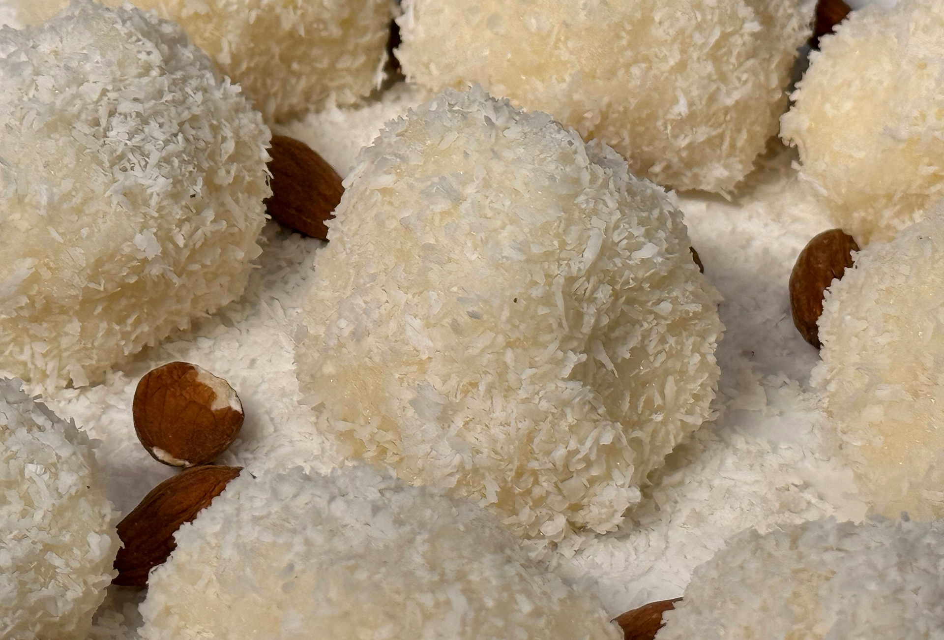 1-2 óra alatt lehűtjük, majd kis golyókat formázunk belőle, a közepébe belenyomjuk a mandulát, és kókuszreszelékbe forgatjuk.