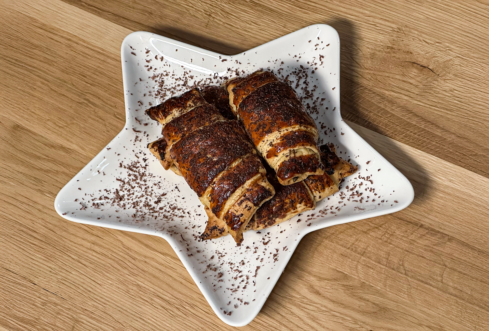 Rendezd a tekercseket egy sütőpapírral bélelt tepsibe, és a tetejüket kend meg villával felvert tojássárgával. Ha maradt még csoki, kívülre is szórhatsz belőle. Told forró sütőbe, és 190 fokon süsd meg körülbelül 15 perc alatt. Amikor szép aranybarna, kiveheted a sütőből.