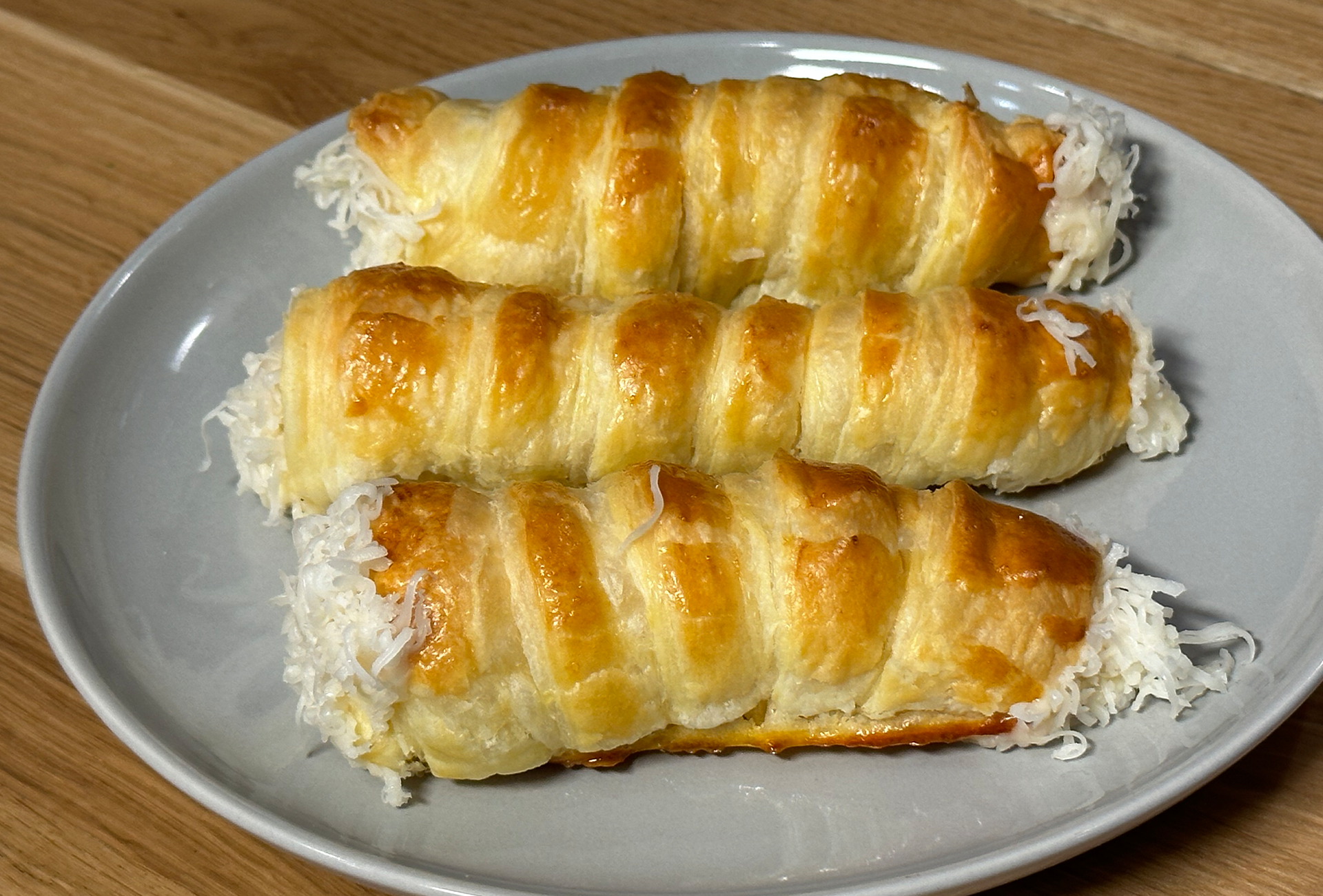 11 lépésA sajtos rolóhoz a leveles tésztát fél centi vastagra kinyújtjuk, majd kb. 1 cm széles csíkokra vágjuk.22 lépésBevajazott és lisztezett - vagy alufóliából gyúrt kis fémhengerekre tekerjük, úgy, hogy a tésztasorok kicsit fedjék egymást.33 lépésA rolókat sütőpapírral bélelt tepsibe sorakoztatjuk, majd tojássárgájával lekenjük és 10-12 perc alatt aranybarnára sütjük.44 lépésA tejből és a lisztből, a sóval, borssal, egy csipet szerecsendióval sűrű krémet főzünk és kihűtjük.55 lépésA kihűlt krémhez hozzáadunk 4 db tojássárgáját, 20 dkg lereszelt trappista sajtot, a krémsajtot és a margarint, és habverő segítségével kikeverjük.66 lépésA krémet habzsákba töltjük, és a kihűlt rolnikba töltjük, majd a rolók mindkét végét a maradék reszelt sajtba mártjuk.