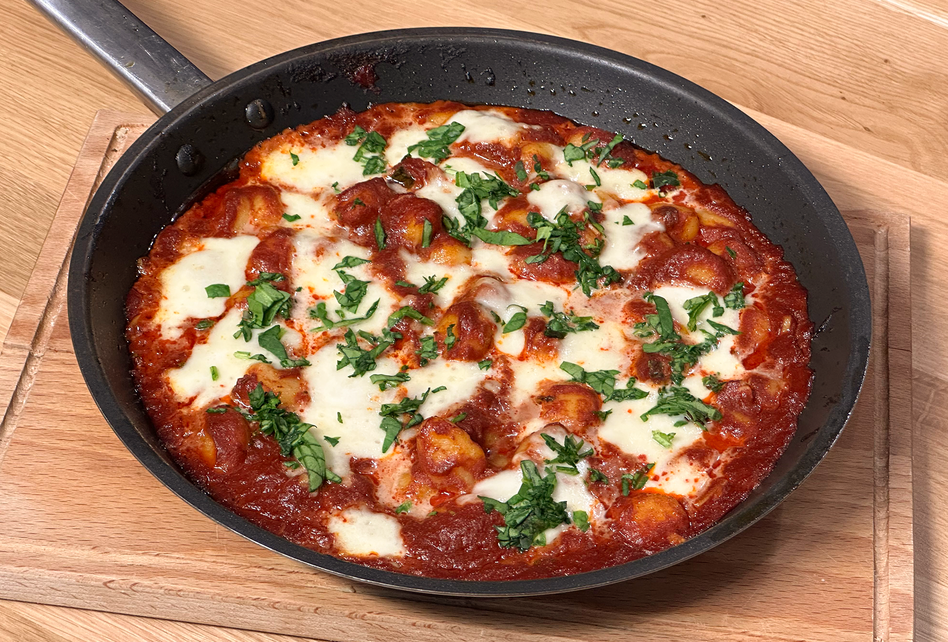 A gnocchit sós, lobogó vízben 2 perc alatt kifőzzük, majd leszűrve a paradicsommártáshoz adjuk. Beleaprítjuk a bazsalikomleveleket, rácsipkedjük a mozzarellát a tetejére, hogy mindenhova jusson, és 230 fokra előmelegített sütőben, kb. 10 perc alatt rásütjük a sajtot. Miután elkészült, tányérokba szedjük és már falhatjuk is.