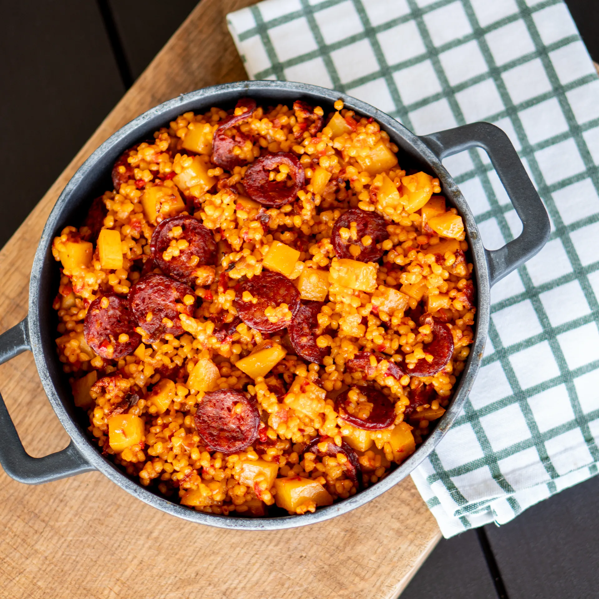 Felhevített lábasban kevés olíva olajon megpirítjuk a szalonnát, kolbászt és a hagymákat. Hozzá adjuk a tarhonyát és burgonyát, amit szintén kissé lepirítunk.