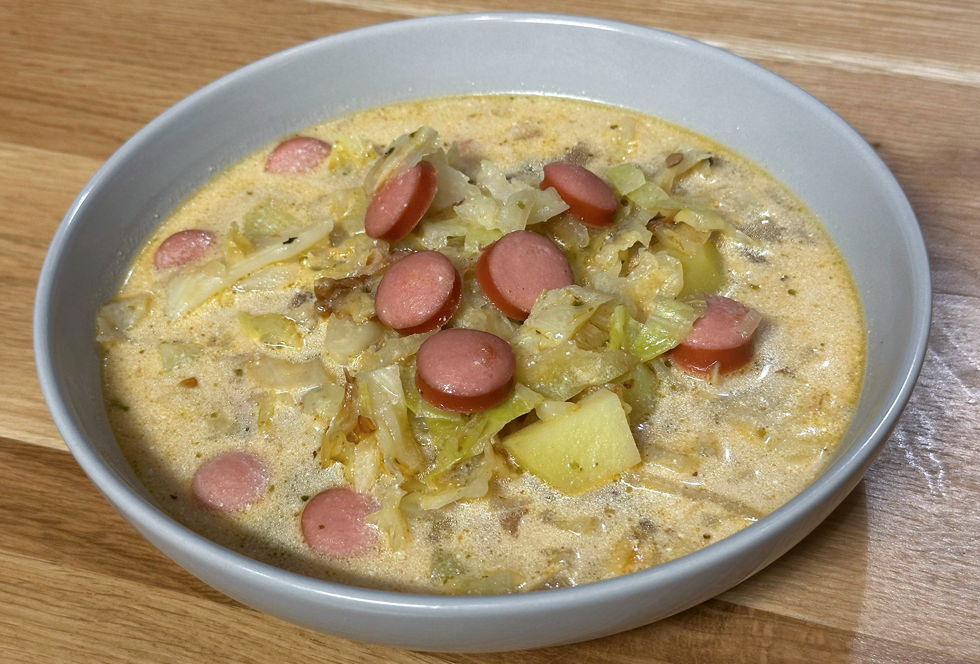 A tejfölös krumplileveshez az olajat felhevítjük egy fazékban, beleszórjuk a kockákra vágott vöröshagymát és üvegesre pároljuk, majd beletesszük a felkarikázott kolbászt és megpirítjuk.