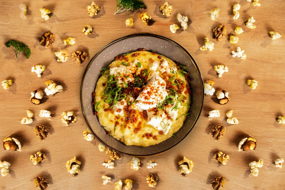 Érlelt sajtos puliszka juhtúrós, pirított szalonnás feltéttel