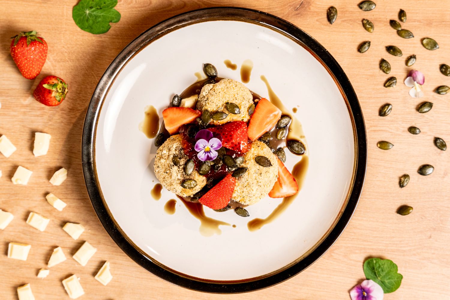 Tökmagos túrógombóc fehércsokoládéval és eperrel