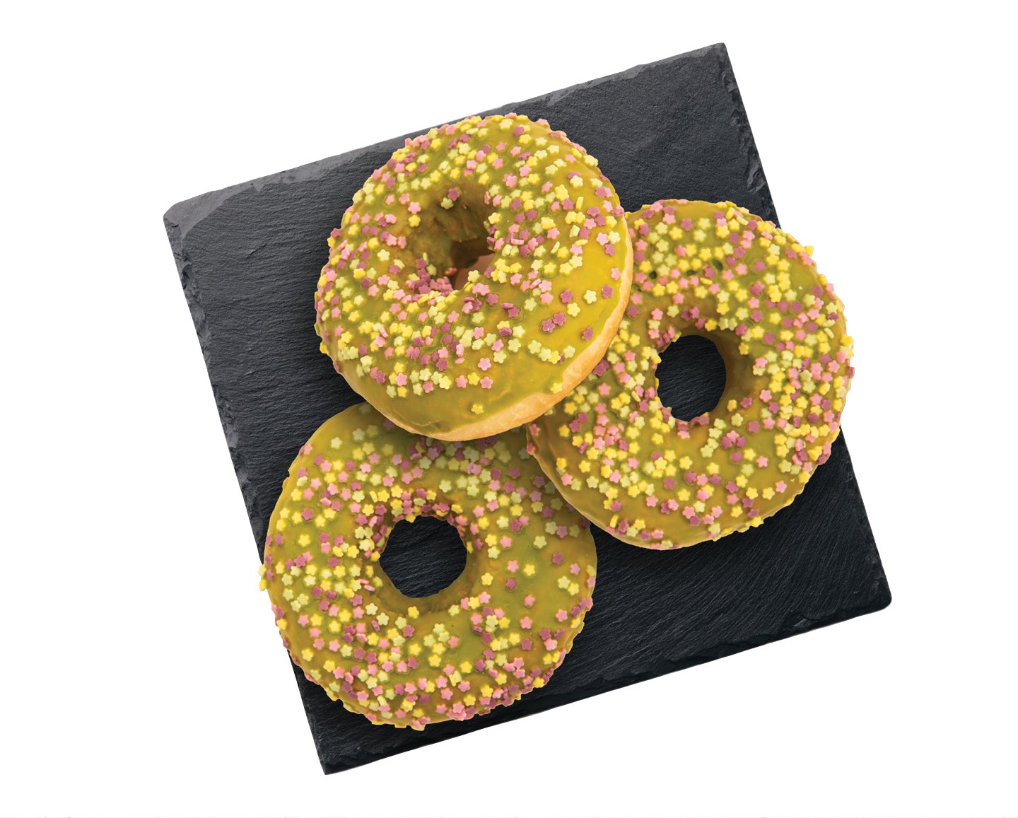 Gyorsfagyasztott majd kiengedett Tavaszi fánk zöld bevonattal, színes cukor szórással