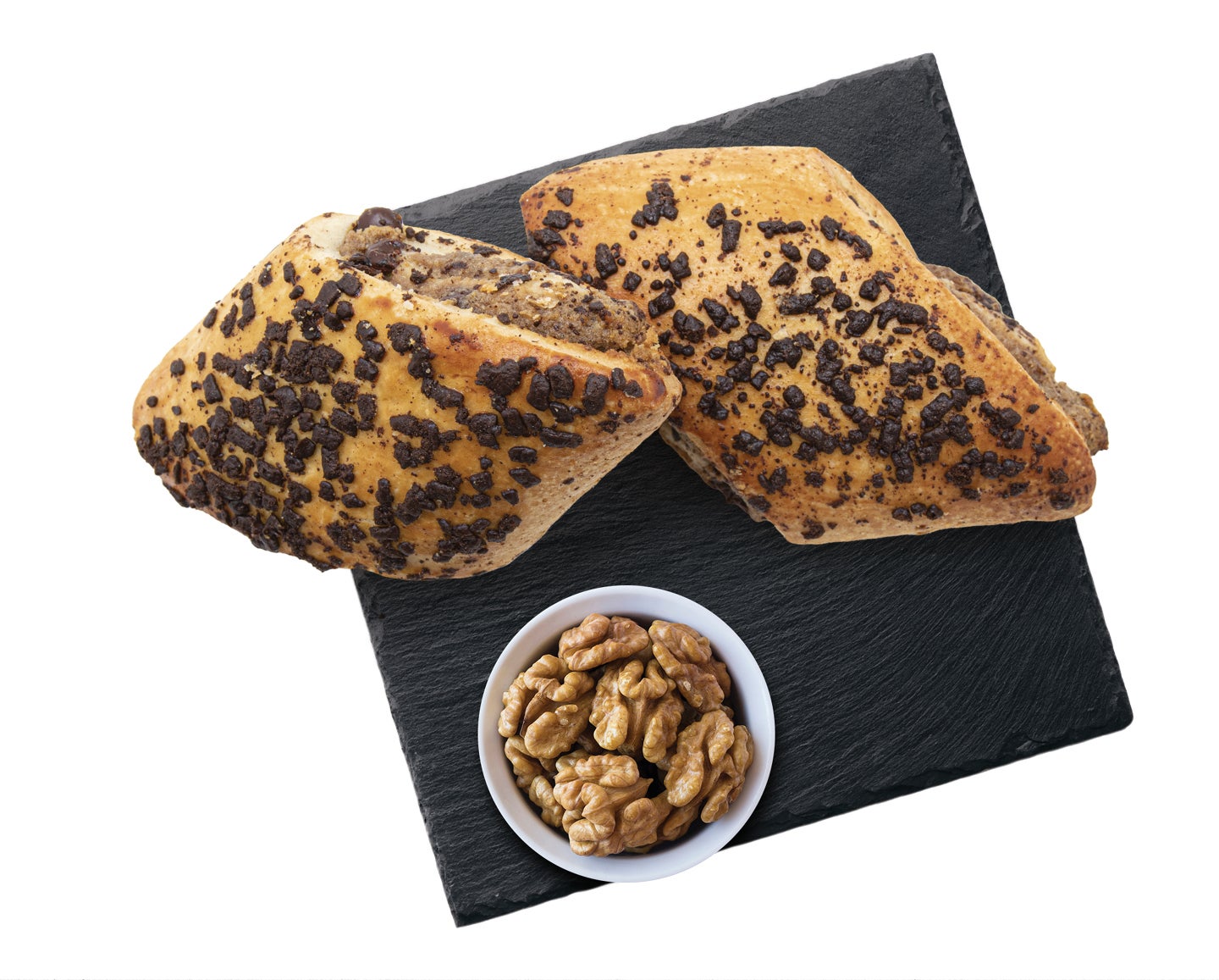 Elősütött, gyorsfagyasztott majd készre sütött tekercs diós-sárgabarackos-csokoládés töltelékkel és csokoládépehellyel a felületén